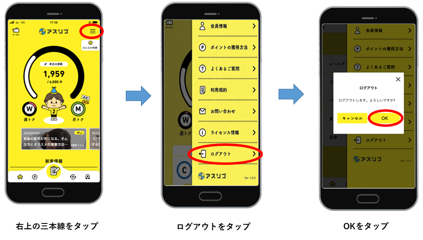 「アスリブ」起動>画面右上「三」>「ログアウト」>「OK」