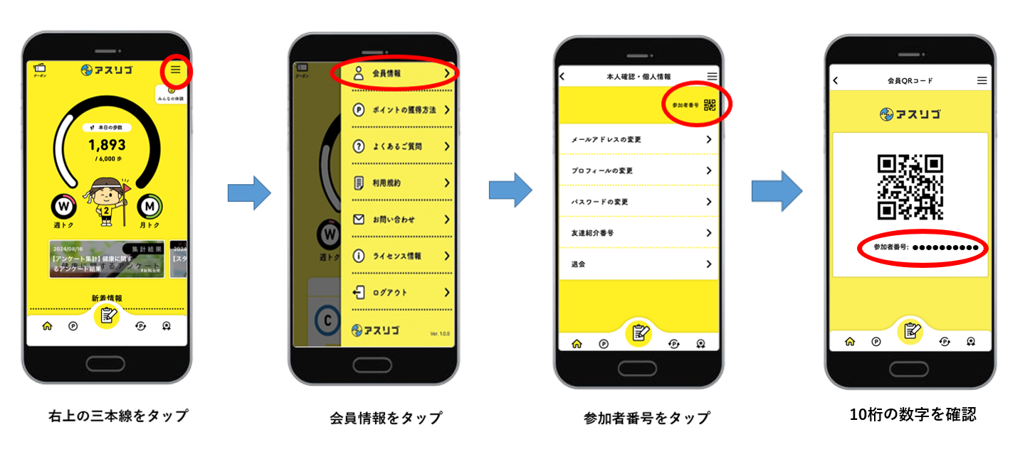 画面右上「三」>「会員情報」>画面右上「参加者番号」