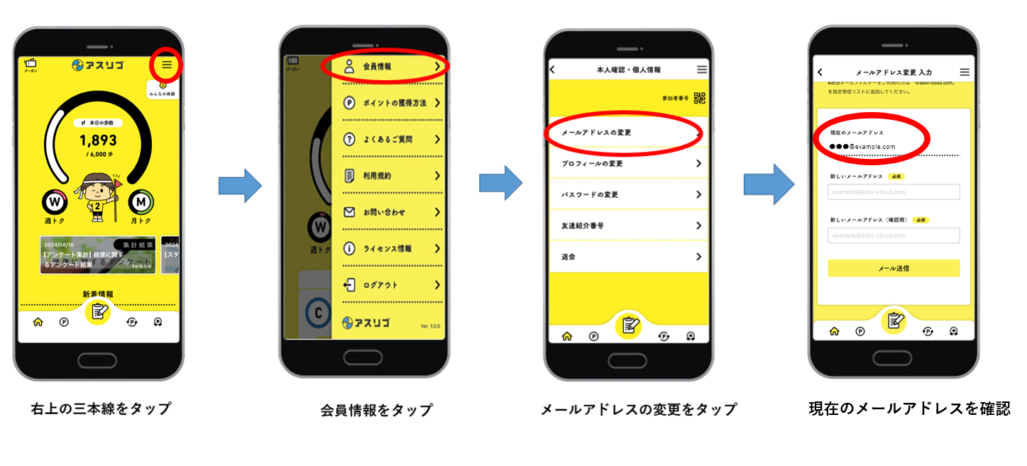 画面右上「三」>「会員情報」>「メールアドレスの変更」>現在のメールアドレス