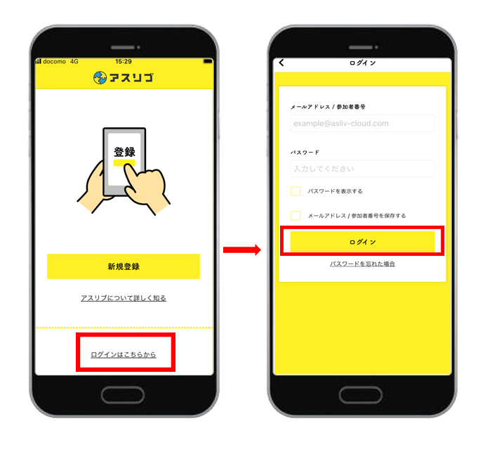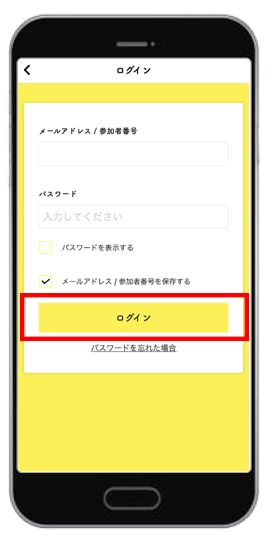 参加者番号 または メールアドレスとパスワードを入力し、「ログイン」を押してください。